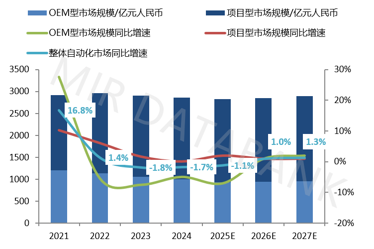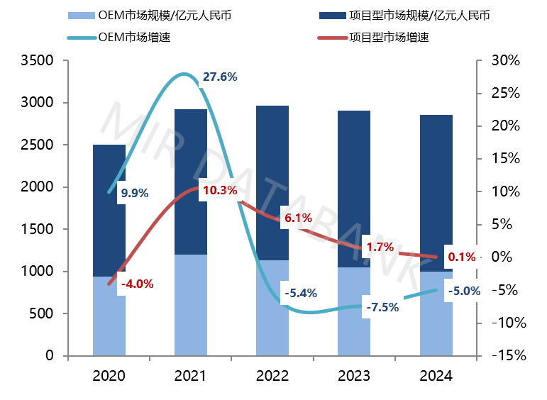 按照MIR DATABANK数据表白,2024年中国OEM从动化市场规模约为1000亿元,同比下降5%,且市场曾经持续三年呈现负增加态势;2024年中国项目型从动化市场规模近2000亿元,同比增加0。1%,且市场曾经持续四年呈现增速放缓态势。
