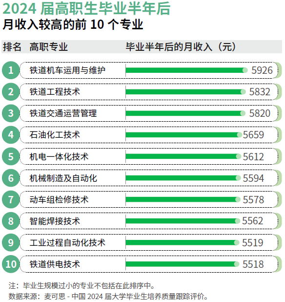 正在就业质量方面,这些“绿牌”专业表示亮眼。2024届铁道机车使用取专业结业生平均月收入达5926元,位列高职专业榜首,就业对劲度和专业相关度均跨越84%;使用化工手艺专业结业生月收入5481元,专业相关度81%,展示出优良的职业成长前景。