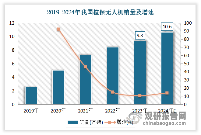 虽然近年我国聪慧农业获得了快速成长,研究及开辟已初具规模,尺度化手艺和使用过程也相对较为成熟。但对比全球市场,我国聪慧农业起步较晚,农业机械化、功课智能化程度远低于其他领先国度(如如高端农业传感、生命消息设备被美国、日本、等企业垄断,大马力高端智能配备较多依赖于进口,动动物发展模子取焦点数据次要来自美国、以色列、荷兰、日本等),市场照旧处于以示范项目指导的成长初期,市场空间广漠。从持久的角度来看,聪慧农业是处理我国生齿取地盘矛盾的主要径。按照国度计谋规划,农业出产运营数字化转型取得较着进展。数字手艺取农业财产系统、出产系统、运营系统融合,大田规模化种植、设备园艺尺度园、水产健康养殖示范场率先实现数字化转型。到2035 年农业农村现代化根基实现,聪慧农业取得标记性进展,我国进入世界农业强国前列。聪慧农业的“新基建”、新理论、新手艺、新配备、新产物、新业态取得冲破,自从立异能力和程度全面提拔,聪慧农业学科取立异团队达到国际一流程度。农业次要环节的数字化全面转向农业全财产链、全环节的数字化和收集化,批量建成少人化或无人化的聪慧农(牧、渔)场,根基建成“软件定义、数据驱动、配备支持、财产融合”的聪慧农业财产系统。农业传感器取测控终端、农业智能配备制制、农业软件等财产规模不竭强大,聪慧农业财产焦点合作力达到国际先辈程度。具体而言,估计大田、设备、畜禽、水产出产数字化程度别离达到 50%、70%、75%、75%,农业数字经济占第一财产 P 的比沉跨越 70%。植保无人机,是用于农林动物功课的无人驾驶飞机,该型无人飞机由飞翔平台(固定翼、曲升机、多轴飞翔器)、飞控、喷洒机构三部门构成,通过地面遥控或飞控,来实现喷洒功课,能够喷洒药剂、种子、粉剂等。近年跟着科技的飞速成长,植保无人机正成为农业范畴的抢手话题。做为现代农业手艺的新兴代表,植保无人机凭仗其经济、环保等劣势,逐步获得了泛博农人伴侣和农业企业的承认。按照数据,2023年我国植保无人机销量达9。3万架,较上年同比增加10。71%。估计2024年我国植保无人机销量达10。6万架,较上年同比增加13。98%。