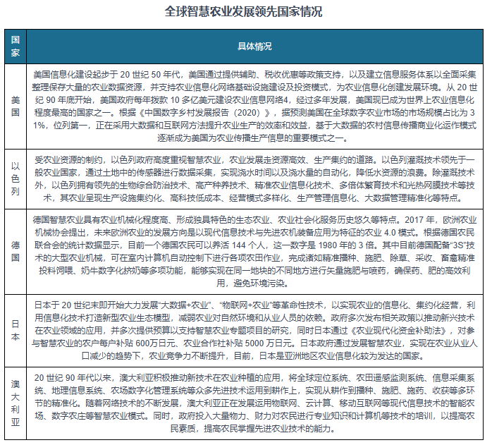 当前聪慧农业已成为世界现代化农业成长趋向,全球都正在加速聪慧农业结构,加深人工智能、大数据、云计较等手艺正在农业范畴的使用。此中美国、以色列、、日本、等国度的聪慧农业成长程度、聪慧农业的软硬件手艺程度处于较为领先的地位。
