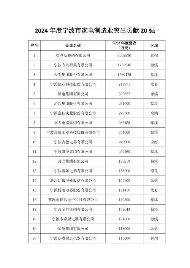 下面按照“2024年度宁波市家电制制业凸起贡献20强”,简单引见一下。上榜的20家企业客岁实现停业收入1591。24亿元;从地域分布来看,慈溪市11家,余姚市3家,北仑区、鄞州区各有2家,奉化区、宁海县各有1家。“全球电熨斗销量冠军”卓力集团、做剃须刀的月立集团、空气炸锅出口代工龙头比依电器、专注厨电范畴40年的帅康集团等榜上出名。有3家企业营收跨越100亿元。