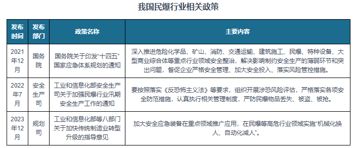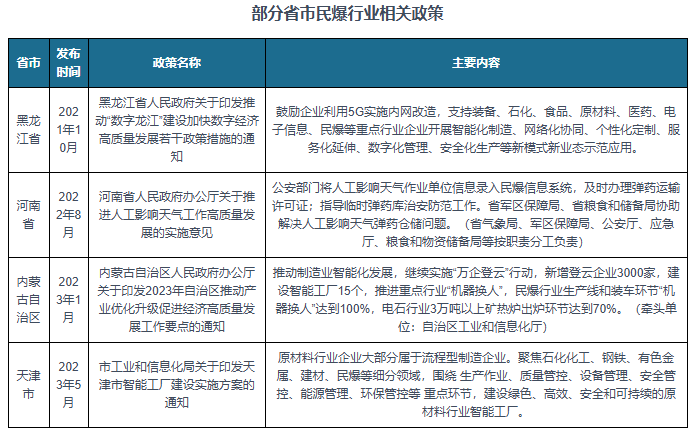 为了响应国度号召,各省市积极鞭策平易近爆行业的成长,好比天津市发布的《市工业和消息化局关于印发天津市智能工场扶植实施方案的通知》提出聚焦石化化工、钢铁、有色金属、建材、平易近爆等细分范畴,环绕 出产功课、质量管控、设备办理、平安管控、能源办理、环保管控等 沉点环节,扶植绿色、高效、平安和可持续的原材料行业智能工场。
