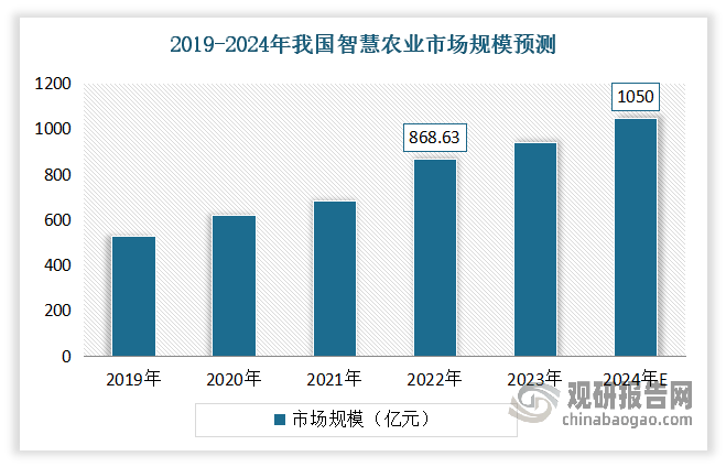 我国农业的根基现状是“大国小农”,农业财产成长仍然受限于农业从业人员匮乏、春秋老化、农业用地削减等问题。因而操纵高新手艺和互联网手艺成长聪慧农业,改变保守农业出产体例,是现代农业成长的必然趋向之一,以农业消息化和人工智能为根本的“聪慧农业”应运而生。正在此布景下,地方连续发布相关政策鞭策聪慧农业成长。例如地方网信办、农业农村部等10个部分结合发布了《数字村落成长步履打算(2022-2025年)》,此中明白提出了加速鞭策聪慧农业成长的聪慧农业立异成长步履。成长聪慧农业既是数字村落扶植的主要构成部门,也是破解我国三农问题、建立现代农业国际合作新劣势所亟需的。到目前我国正在聪慧农业范畴曾经根基成立了一套完整的政策系统,涵盖了从地方层面四处所的施行,从根本设备扶植到手艺推广使用和社会化办事。近年得益于我国全方位政策盈利支撑、财务投入不竭添加,我国聪慧农业市场快速成长。数据显示,2022年我国聪慧农业市场规模为868。63亿元,同比增加约26。81%。估计到2024年我国聪慧农业市场规模达到到1050亿元。